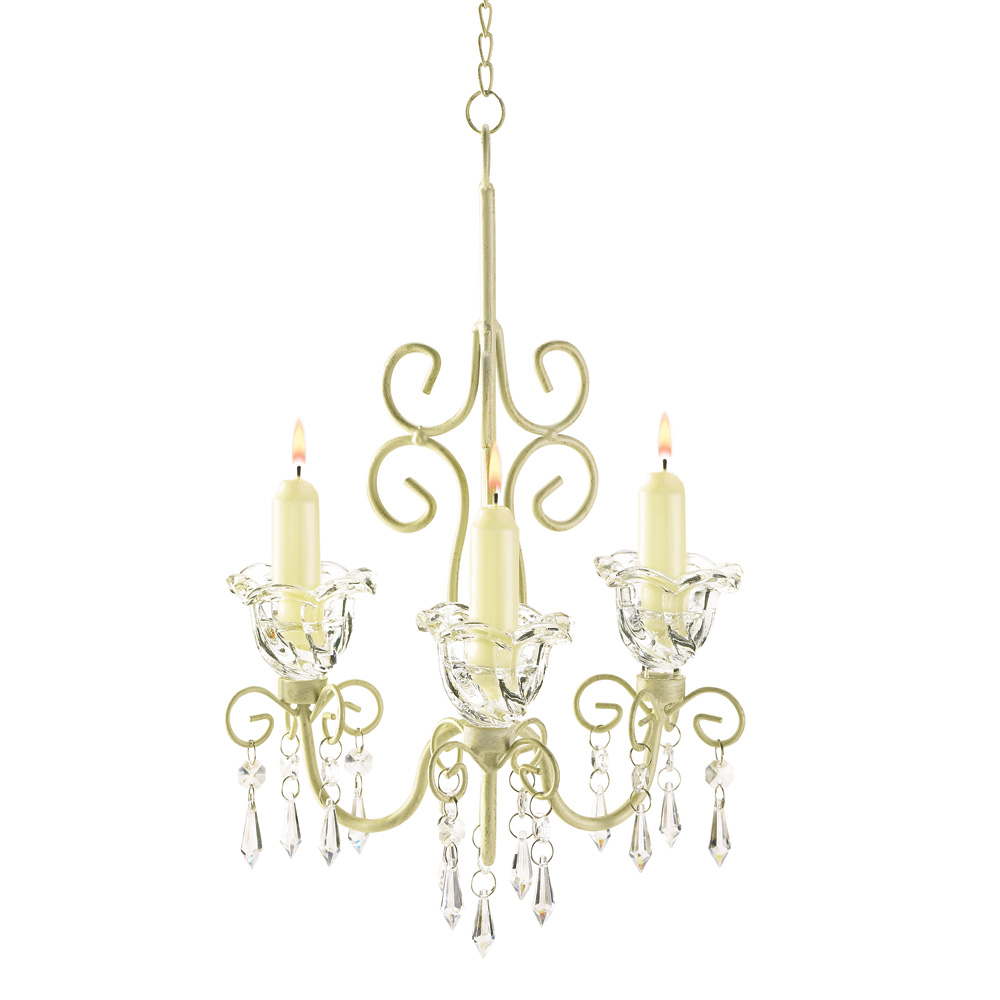 • Elegant distressed-ivory scrollwork and glimmering crystals turn candle glow into a captivating show. Instantly create an airy French provincial ambiance with this courtly chandelier!