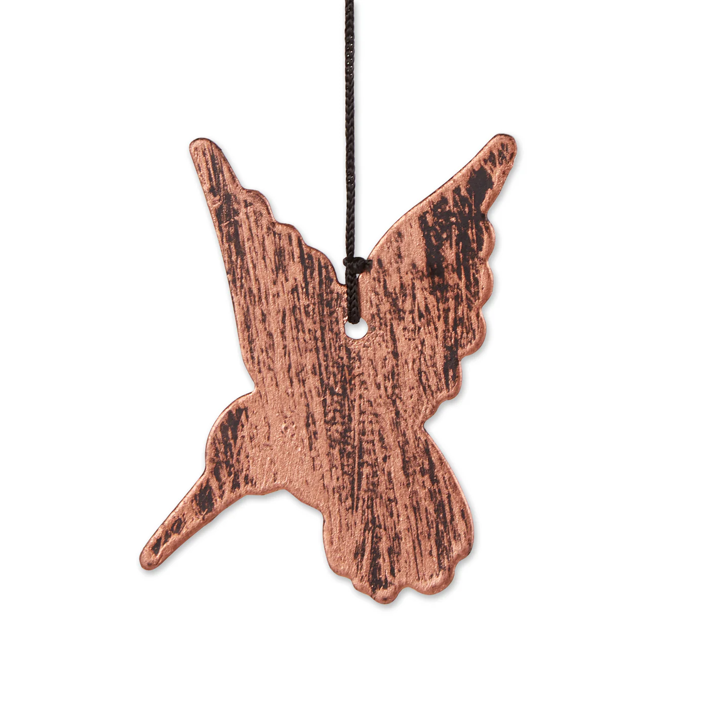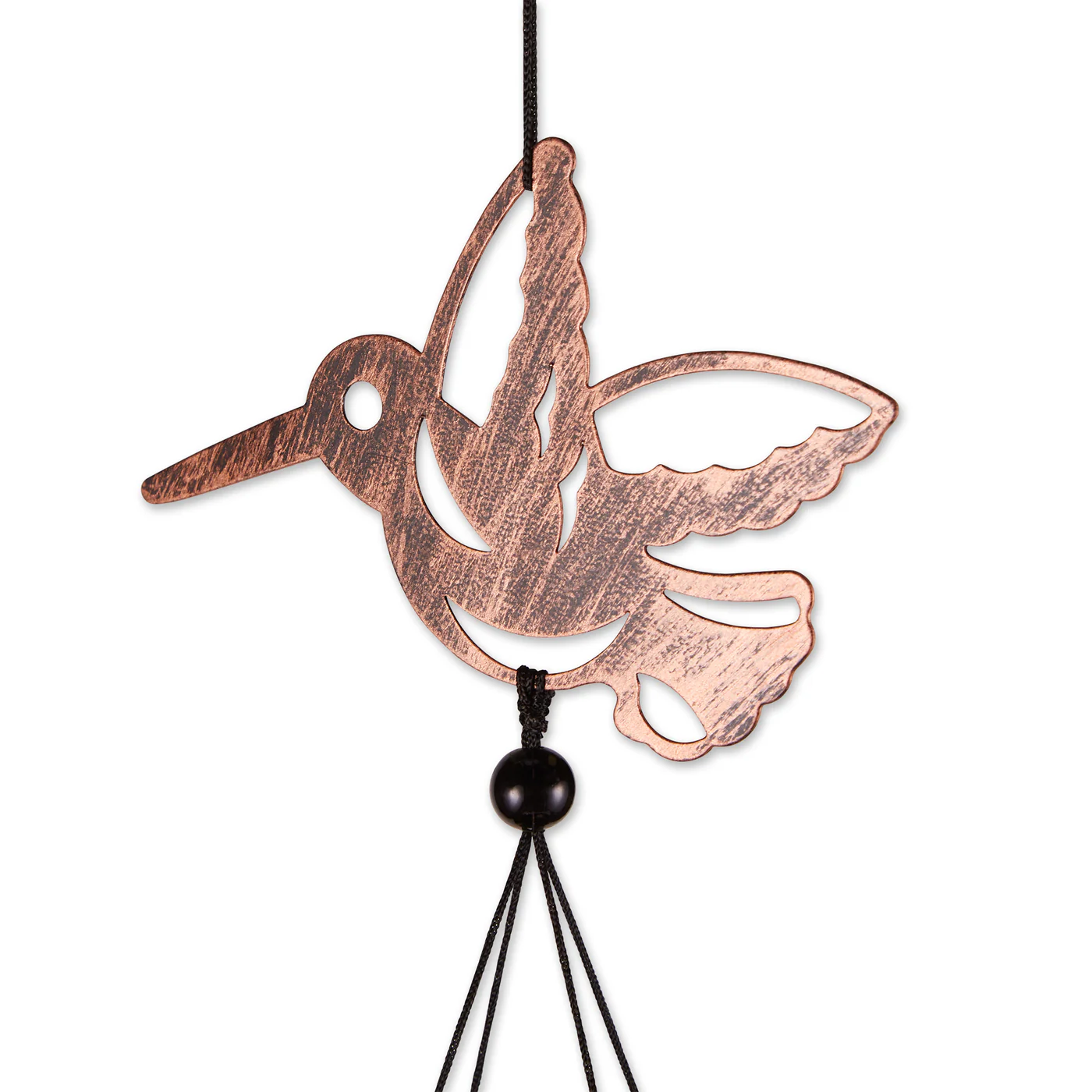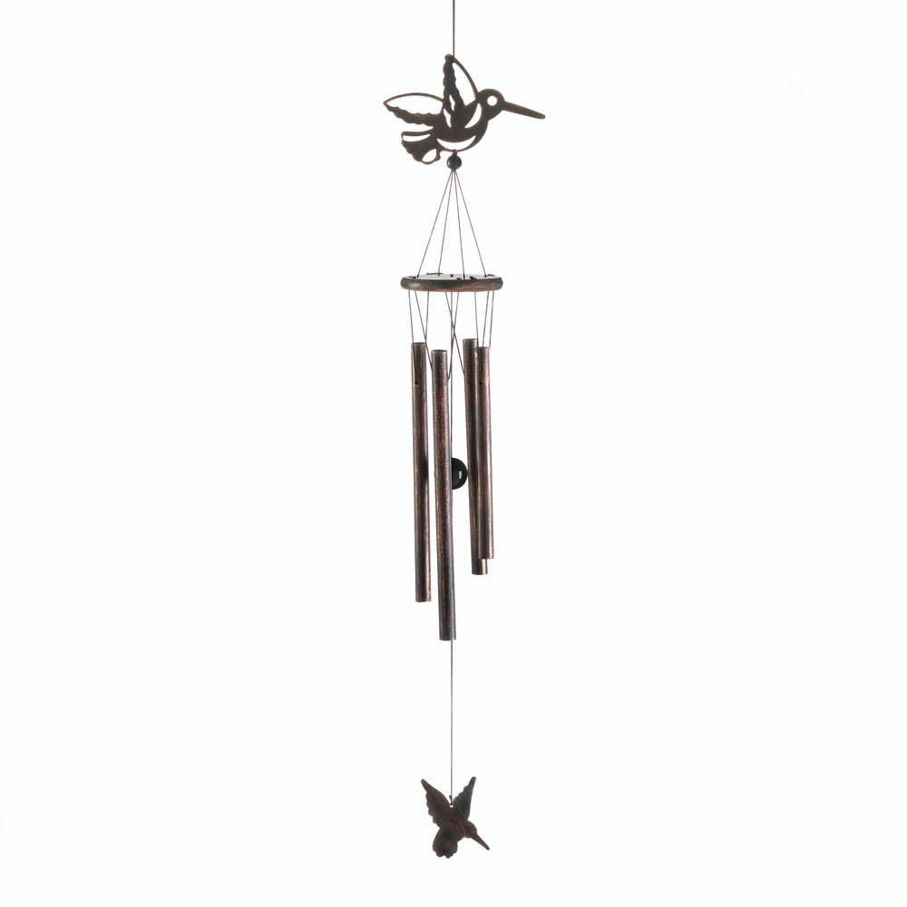 • When the wind flutters through this beautiful wind chime, it will fill your ears with tinkling music. This wind chime features a cutout hummingbird ornament on top and a lovely hummingbird charm below.