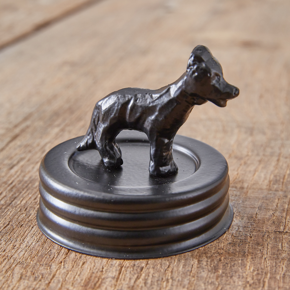 We can't help but spoil our pups with lots of treats! Store them for freshness inside our farmhouse staple mason jar. The jar is created of glass and features embossed lettering with the phrase ''Dog Treats'' on the front. The metal lid features a German shepherd on top.