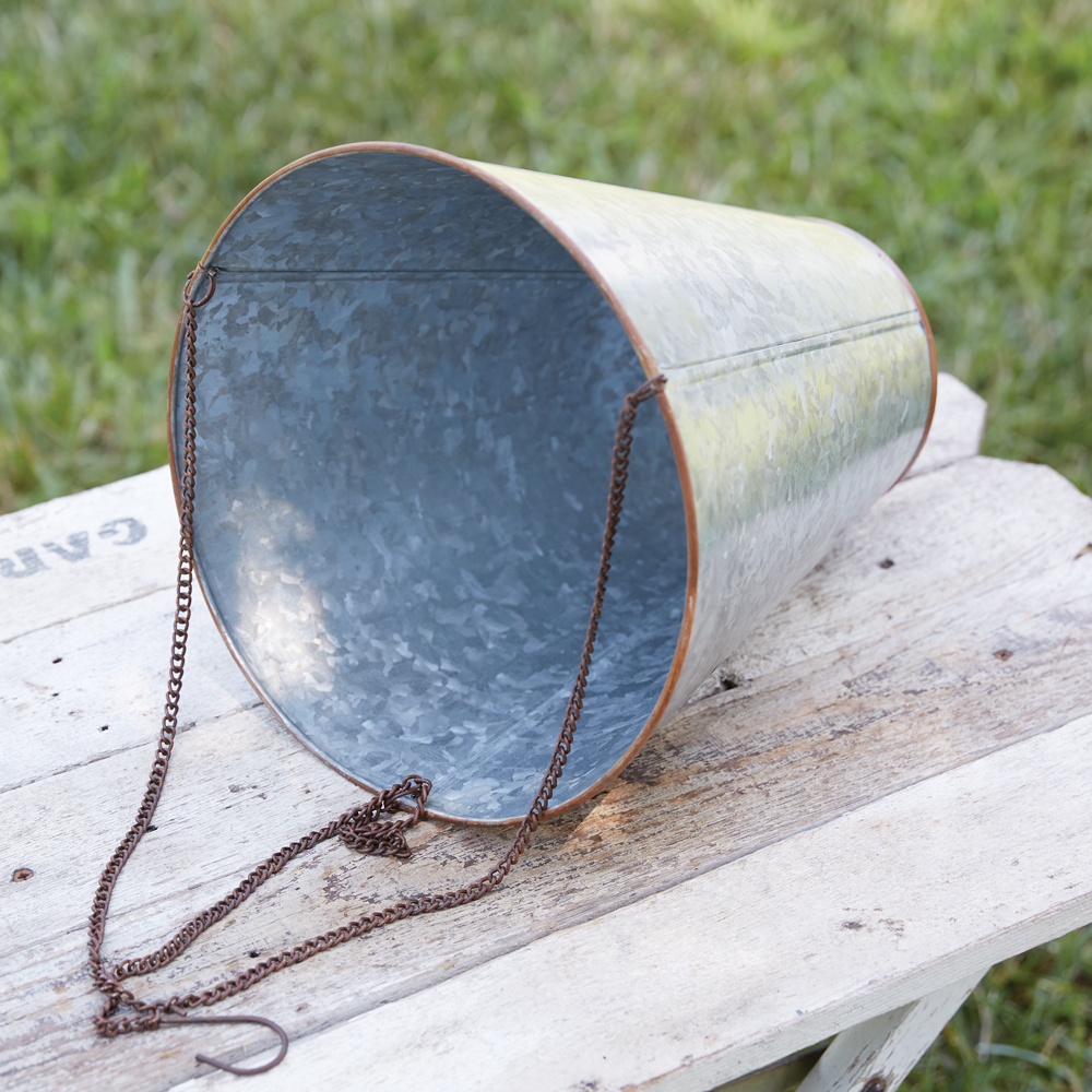 Our galvanized cone planter brings a farmhouse touch to your garden decor. Display your favorite artificial flowers inside and hang on a patio. Item is made of metal and measures 26''H when hung from the chain.